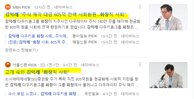 결국 김익래 회장은 다우데이터, 다우그룹 회장직에서 물러나겠다고 발표하였습니다. 회장직을 내려놓겠다고 선언하고, 6백억 원은 모두 사회에 환원한다고 발표했네요. 본인은 잘못이 없고, 주식 매각은 정당했다고 했지만 사회적인 여론이 너무 안 좋게 변해서 그런지 회장직을 내려놓는 것 이외에 다우데이터 주식매각 대금 사회 환원을 발표한 김익래 회장입니다.