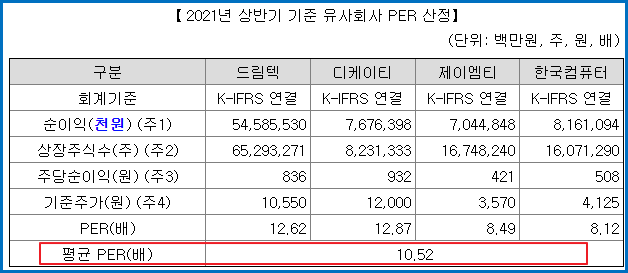 공모가 결정방법은 유사기업의 2021년 상반기 PER을 기준을 산정하였으며, 최종 4개 기업을 비교하여 최종 PER을 산정하였습니다. 4개 기업은 드림텍, 디케이티, 제이엠티, 한국컴퓨터 이며, 각 기업의 PER을 기준으로 평균한 적용 PER은 10.52로 최종 결정하였습니다.