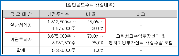 모집방법은 신주모집과 구주매출을 구분해서 하지만 전체 배정내역은 위와 같은 비율로 구분되어 진행된다고 보시면 됩니다. 전체 공모금액인 267억원 중 일반투자자대상 청약금액은 최대 30%로 약 80억원정도 입니다.