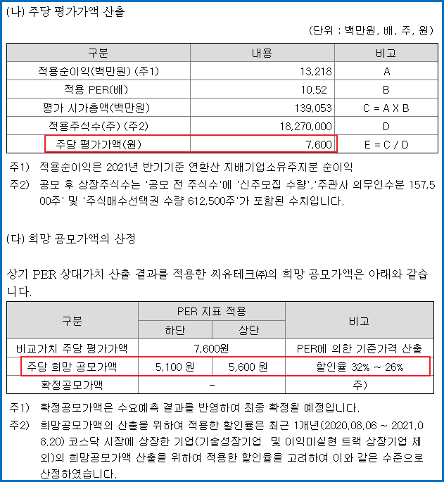씨유테크의 희망공모가는 5,100원~5,600원입니다. 확정공모가는 기관수요예측결과를 바탕으로 결정될 예정입니다.