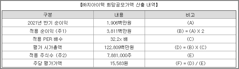 지아아텍의 2021년 상반기 순이익은 19억원을 연환산하여 적용 PER을 곱해서 시총을 산출하였으며, 적용주식수 7,881,000주를 적용하여 주당 평가액인 15,583원을 산출하였고 할인율을 적용하여 최종 희망공모가 산정