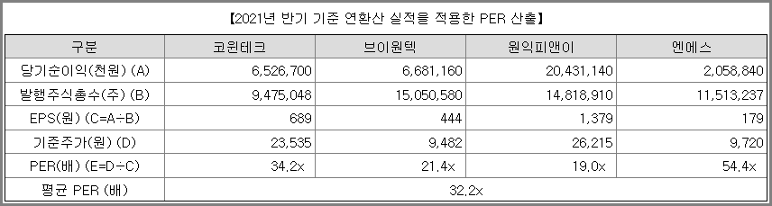 유사기업은 동종업계 기업중 사업유사성, 재무 및 일반 유사성, 비교유의성 등을 토대로 최종 4개기업을 선정하였습니다. 선정된 4개 기업은 코위테크, 브이원텍, 원익피앤이, 엔에스 이며 이들 기업의 2021년 반기 실적을 이용하여 PER산출하였습니다.