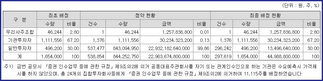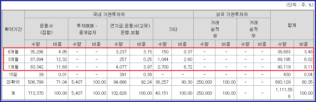 기관투자자 의무확약비율의 경우 수량기준 8.37% 수준이었으며 배정현황은