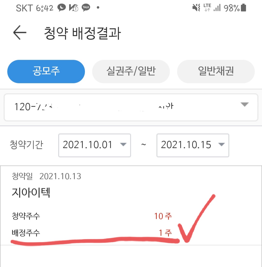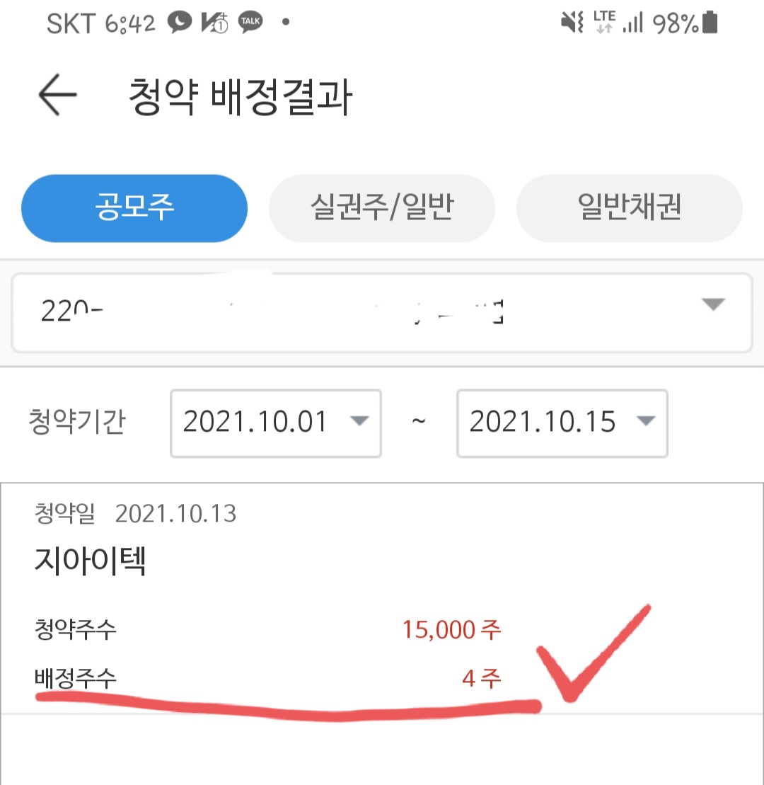 지아이텍의 청약 경쟁률은 예상했듯이 매우 높은 수준입니다. 청약을 시작한 1일차부터 지속적으로 경쟁률을 끌어올렸으며 최종 5,936 대 1로 마감했습니다. 저 역시 지아이텍에 균등과 비례를 동시에 3개 계좌를 이용해 청약을 신청했으며 총 6주를 배정 받았습니다.
