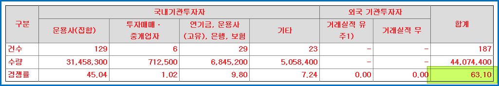 2. 수요예측경쟁률 : 63.1 대 1
