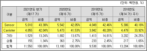 매출상황은 센서와 캐니스터 매출이 대부분이며