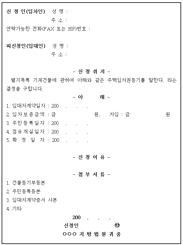 바로 주택의 소재지를 관할하는 지방법원이나, 또는 시, 군, 구 법원에 가서 신청을 하는 것이다. 집주인에게 무슨 서류를 받을 필요가 없기 때문에, 내가 세입자라면 서류를 준비해서 그냥 법원에 가 신청을 하면 되는 것이다. 단, 임차권등기명령을 하려면, 처음 전세집에 들어갈 때, 전입신고를 당연히 해야만 대항력이 있습니다.