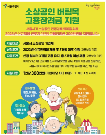 서울시에서는 기업운영이 어려운 소상공인들을 위해 1인당 300만원까지 지원을 하는 소상공인 버팀목 고용장려금을 지급하고 있습니다. 4월 3일부터 신청을 받고 있으며, 예산이 소진되면 지원이 안될 수도 있으니 미리미리 신청하시길 바랍니다. 오늘은 서울시 소상공인 버팀목 고용장려금 신청에 대한 모든 정보를 알려드리겠습니다.
